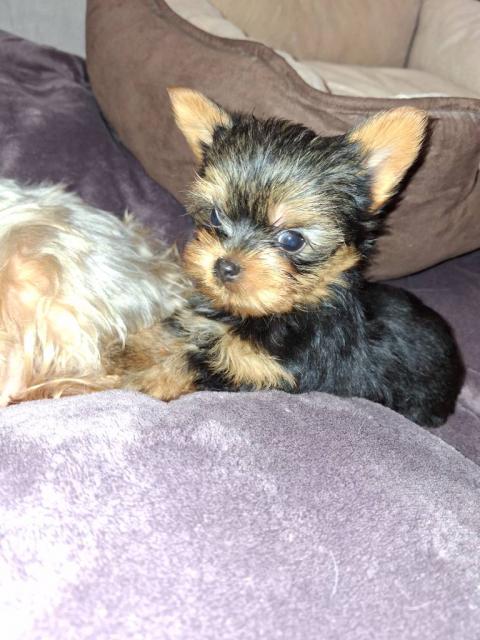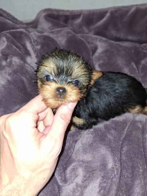 Grynakraujai Jorkšyro terjero šuniukai, baby-face tipo.