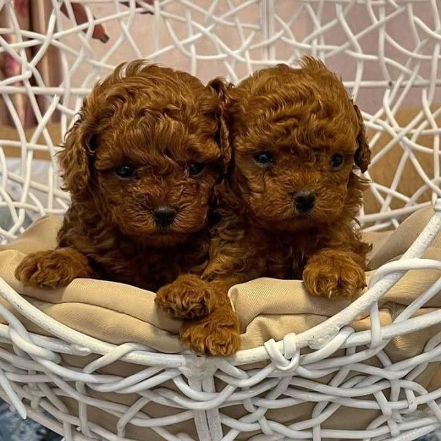 Turime abrikosinių ir raudonų žaislinių pudelių jauniklių.
