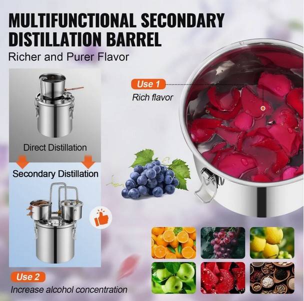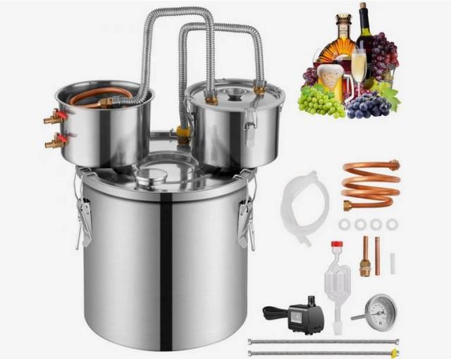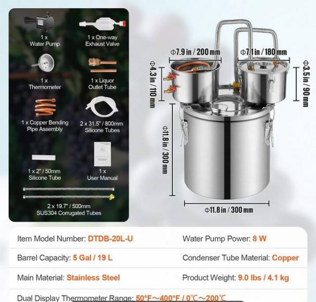 Distiliatoriaus rinkini sudaro: vienas 20l nerudijancio plieno katilas, vienas kondensatorius su saldančiu nerudijancio plieno vamzdeliu, vienas papildomas kondensato sodrinimo puodas, vienas oro voztuvas fermentavimui, vienas termometras, vienas isleidimo voztuvas ir du silikoniniai vamzdeliai, du gofruoto, nerudijancio plieno vamzdeliai, termometras, elektrine vandens pompa.